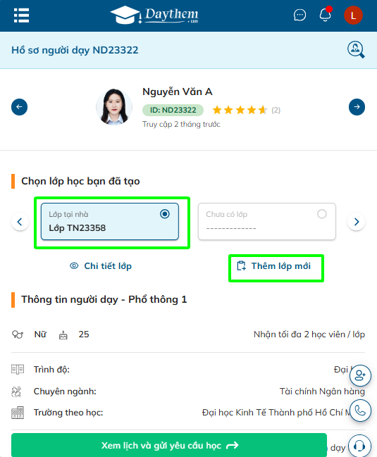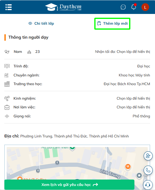 Bước 4: Người học chỉ xem được thông tin cơ bản của người dạy như: họ tên, độ tuổi, trình độ, trường học. Để xem chi tiết về bằng cấp, kinh nghiệm, giọng nói, mức học phí nhận lớp, hãy nhấn “Thêm lớp mới” để tạo lớp và chọn hồ sơ người dạy.