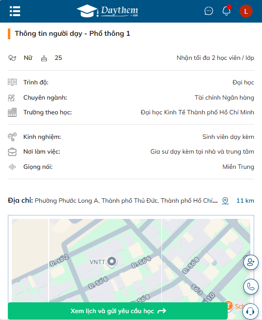 Bước 5: Người học xem hồ sơ chi tiết hơn của người dạy, bao gồm thông tin cá nhân, trình độ chuyên môn, chứng chỉ, bằng cấp, khoảng cách và mức học phí.