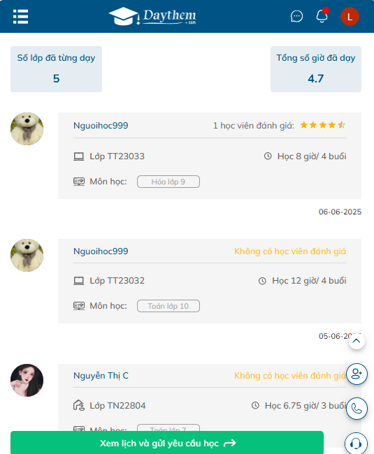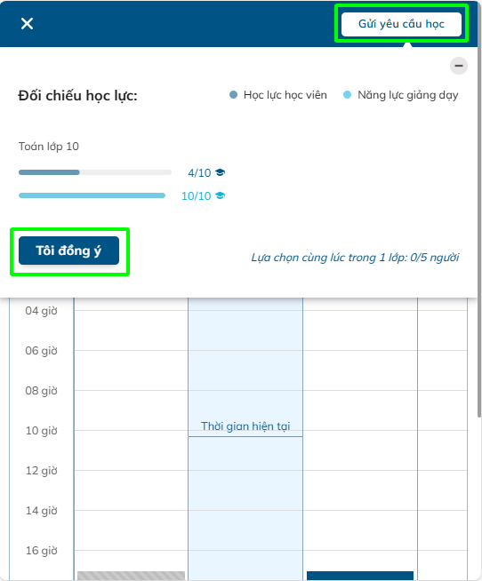 Ngoài ra, người học nhấn vào “Xem lịch và gửi yêu cầu học” để kiểm tra sự trùng khớp giữa thời gian học của mình và thời gian của người dạy.