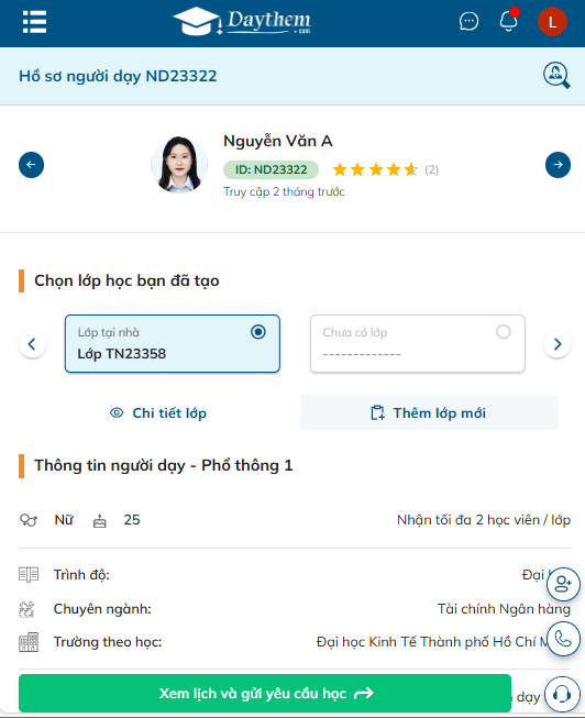 Nếu tìm thấy người dạy phù hợp, người học nhấn “Xem hồ sơ” để xem chi tiết về chuyên môn, kinh nghiệm giảng dạy và đánh giá từ học viên trước. Điều này giúp người học có cái nhìn toàn diện trước khi đưa ra quyết định tuyển chọn.