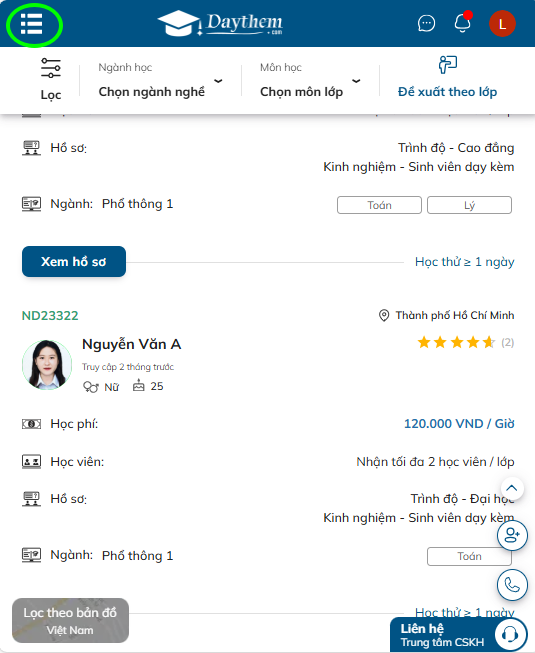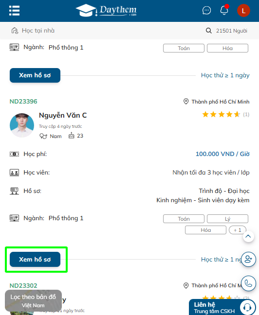 Bước 3: Hệ thống hiển thị tất cả hồ sơ người dạy đăng ký dạy tại nhà. Người học có thể lướt xem và nhấn “Xem hồ sơ” để tìm hiểu thêm nếu thấy phù hợp.