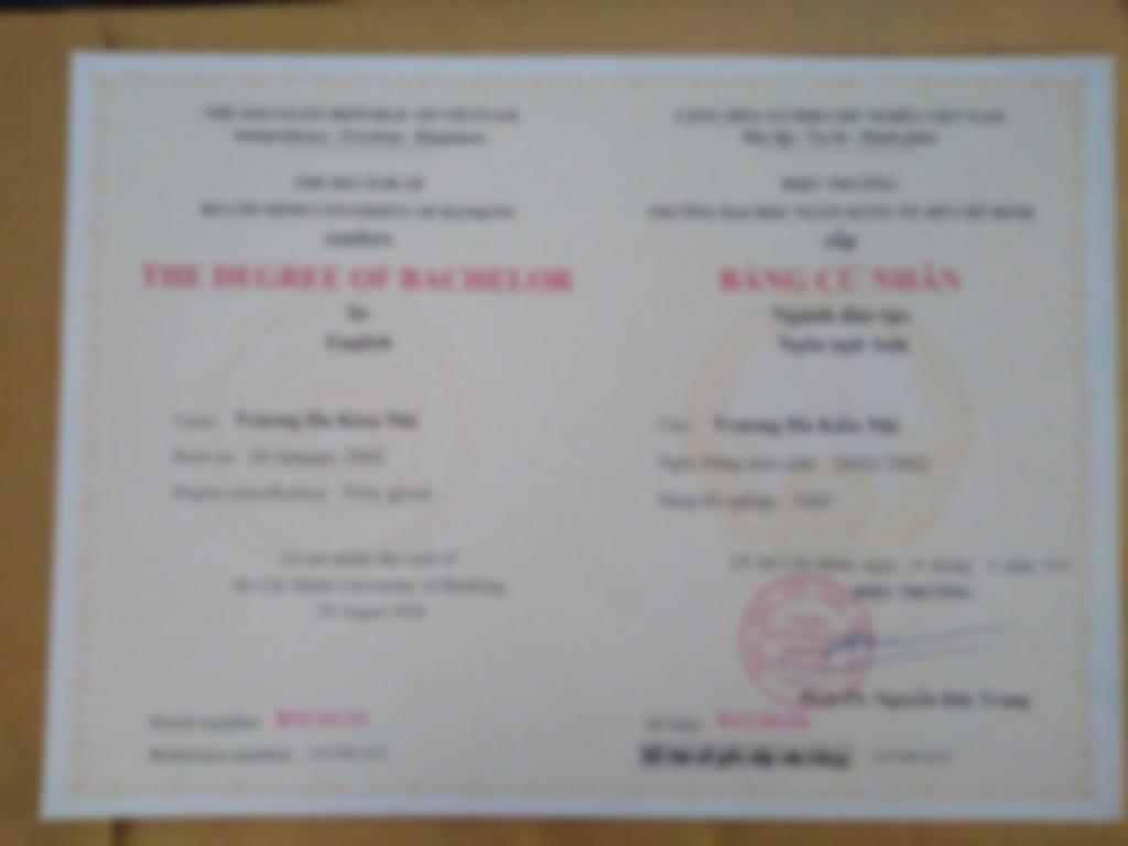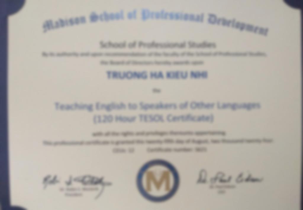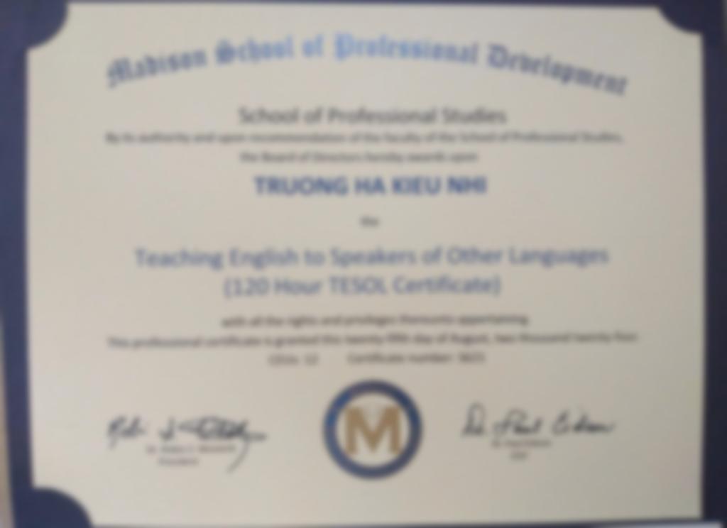 Tôi tốt nghiệp Cử nhân Ngôn ngữ Anh loại Giỏi, sở hữu chứng chỉ TOEIC 945/990 và TESOL 120 giờ. Với hơn 4 năm kinh nghiệm gia sư tiếng Anh cho học sinh các cấp và 1 năm giảng dạy TOEIC, giao tiếp cho sinh viên, người đi làm, tôi thành thạo sử dụng đa dạng giáo trình quốc tế như Family and Friends, Chân Trời Sáng Tạo, National Geographic Learning, Mindset for IELTS. Tôi cam kết mang đến lộ trình học tập cá nhân hóa, hiệu quả và khoong khí lớp học vui nhộn, truyền cảm hứng cho học viên.