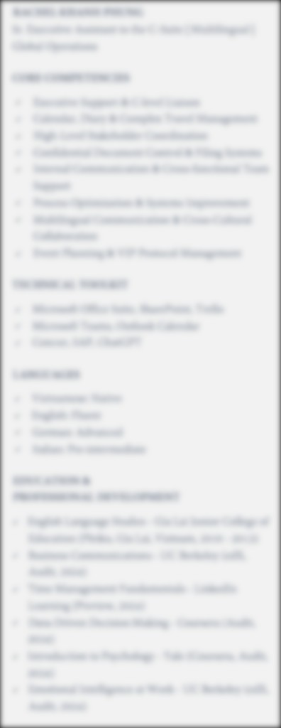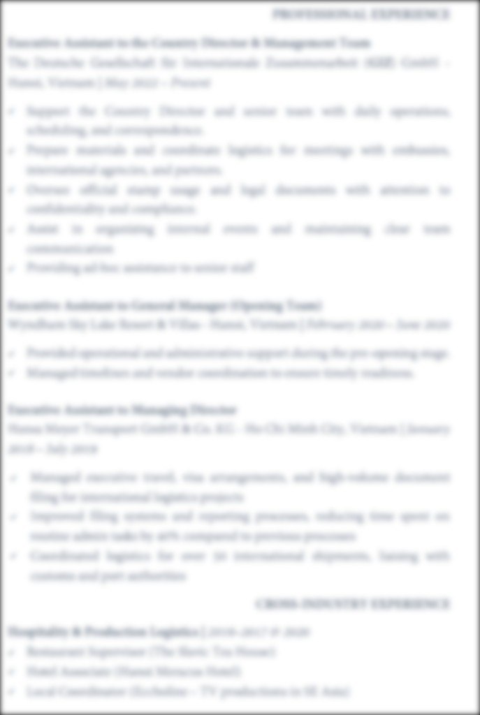 Sau hơn 10 năm sử dụng tiếng Anh trong các môi trường làm việc quốc tế và 4 năm với tiếng Đức, tôi đã trải qua rất nhiều tình huống thực tế, nơi ngôn ngữ không chỉ là công cụ giao tiếp mà là chìa khóa để mở rộng cơ hội. Tôi tin rằng học ngôn ngữ không phải chỉ là ghi nhớ từ vựng hay ngữ pháp, mà là khả năng tự tin và linh hoạt giao tiếp trong cuộc sống hàng ngày. Phương pháp của tôi không chỉ giúp học viên cải thiện khả năng ngôn ngữ mà còn khám phá được niềm vui trong việc sử dụng tiếng Anh và tiếng Đức một cách tự nhiên và tự tin. Với tôi, việc dạy ngôn ngữ là một hành trình chia sẻ, và tôi muốn đồng hành cùng học viên để giúp các em không chỉ học, mà còn yêu thích và thực sự áp dụng ngôn ngữ vào cuộc sống và công việc.