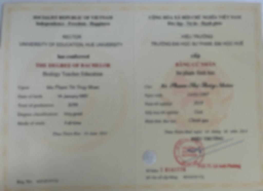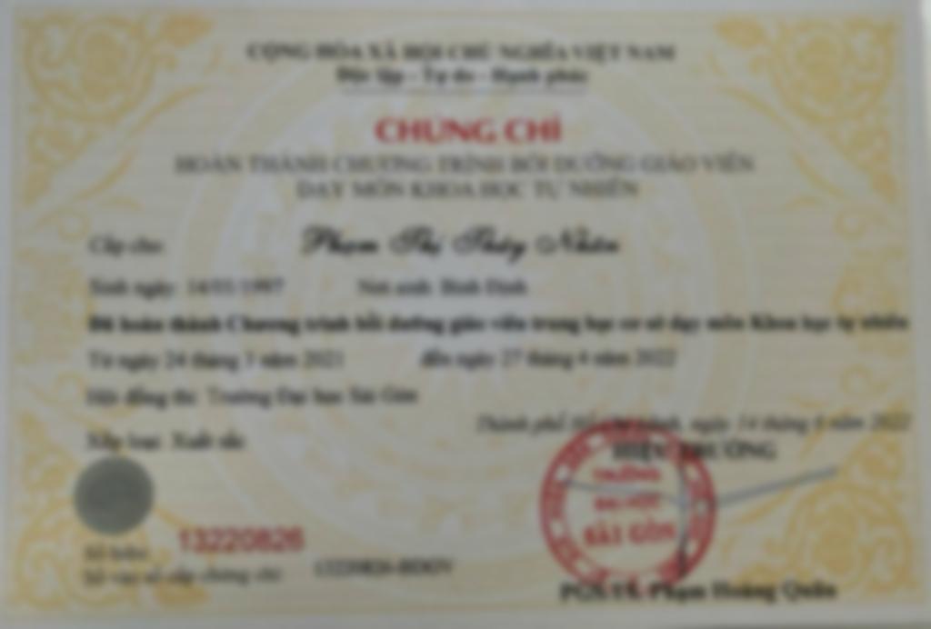 Tốt nghiệp loại giỏi trường ĐH Sư phạm Huế, loại xuất sắc môn Khoa học tự nhiên tại ĐH Sài Gòn. Đã công tác 7 năm ở vị trí GVQN trường tư tại Sài Gòn kiêm bộ môn KHTN và dạy toán phụ đạo khối cấp 2 tại trường. Đã dạy rất nhiều học sinh môn KHTN và Toán giúp các em củng cố kiến thức và đạt kết quả từ mất gốc, trung bình đến khá giỏi.