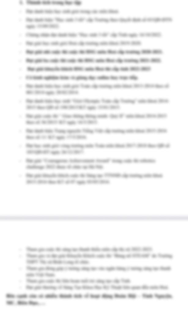 Đạt danh hiệu học sinh giỏi trong các niên khoá. - Đạt danh hiệu "Học sinh 3 tốt" cấp Trường theo Quyết định số 03/QĐ-ĐTN ngày 15/09/2022. - Chứng nhận đạt danh hiệu “Học sinh 3 tốt” cấp Tỉnh ngày 16/10/2022. - Đạt giải học sinh giỏi Hoá cấp trường niên khoá 2019-2020. - Đạt giải nhì cuộc thi cuộc thi HSG môn Hoá cấp trường 2020-2021. - Đạt giải ba cuộc thi cuộc thi HSG môn Hoá cấp trường 2021-2022. - Đạt giải khuyến khích HSG môn Hoá thi cấp tỉnh 2022-2023 - Có kinh nghiệm kèm và giảng dạy online hay trực tiếp. - Đạt danh hiệu học sinh giỏi Toán cấp trường niên khoá 2013-2014 theo số 001/2014 ngày 28/02/2014. - Đạt danh hiệu học sinh “Giỏi Olympic Toán cấp Trường” niên khoá 2014- 2015 theo QĐ số 198/2015/KT ngày 15/01/2015. - Đạt giải cuộc thi “ Giao thông thông minh- Quý II” niên khoá 2014-2015 theo số 36/2015/ KT ngày 16/3/2015. - Đạt danh hiệu Trạng nguyên Tiếng Việt cấp trường niên khoá 2015-2016 theo số 11/ KT ngày 17/5/2016. - Đạt học sinh giỏi vòng trường môn Toán niên khoá 201