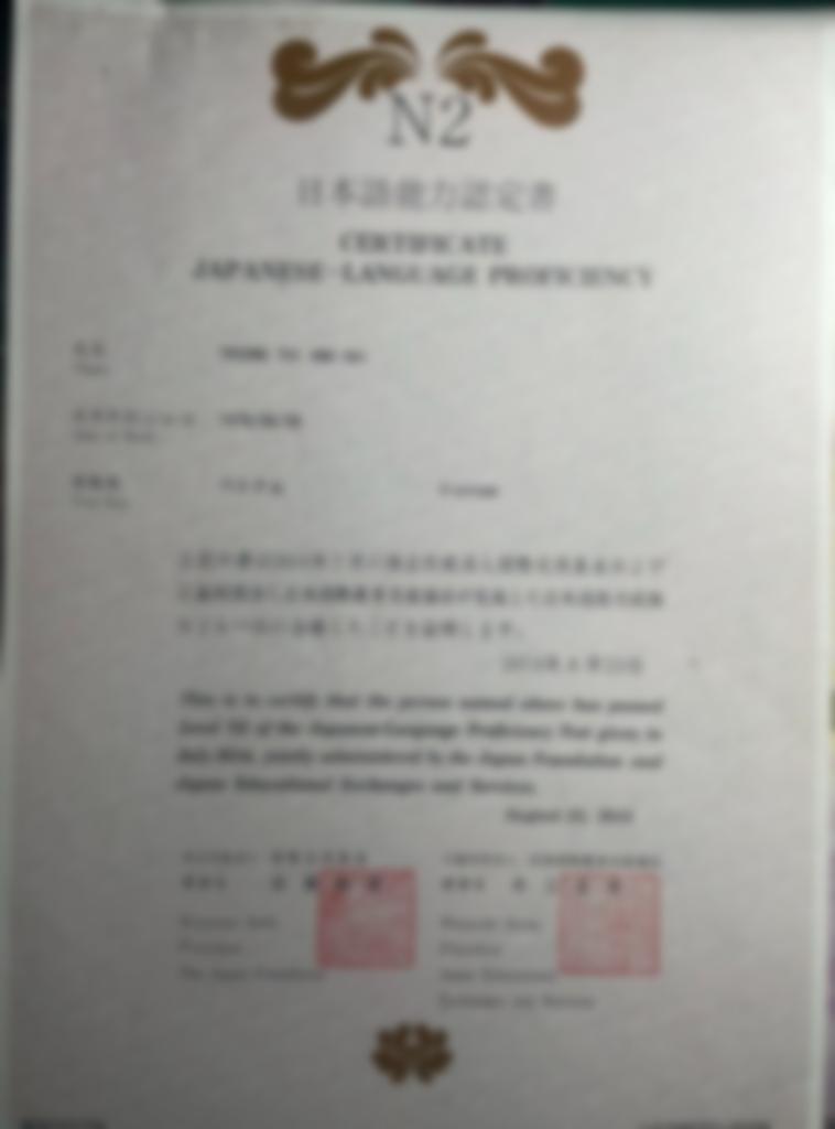 +Tốt nghiệp Đại học Sư phạm Huế +Có bằng Năng lực Nhật ngữ JLPT N2. +15 năm dạy tiếng Nhật cho thực tập sinh đi lao động Nhật Bản. +Nhiều lần đi công tác Nhật Bản ở các hiệp hội và nhà máy Nhật Bản. +Nhiều năm dạy luyện thi Năng lực Nhật ngữ JLPT từ N5-N3. +Tự học tiếng Anh trình độ tương đương A2
